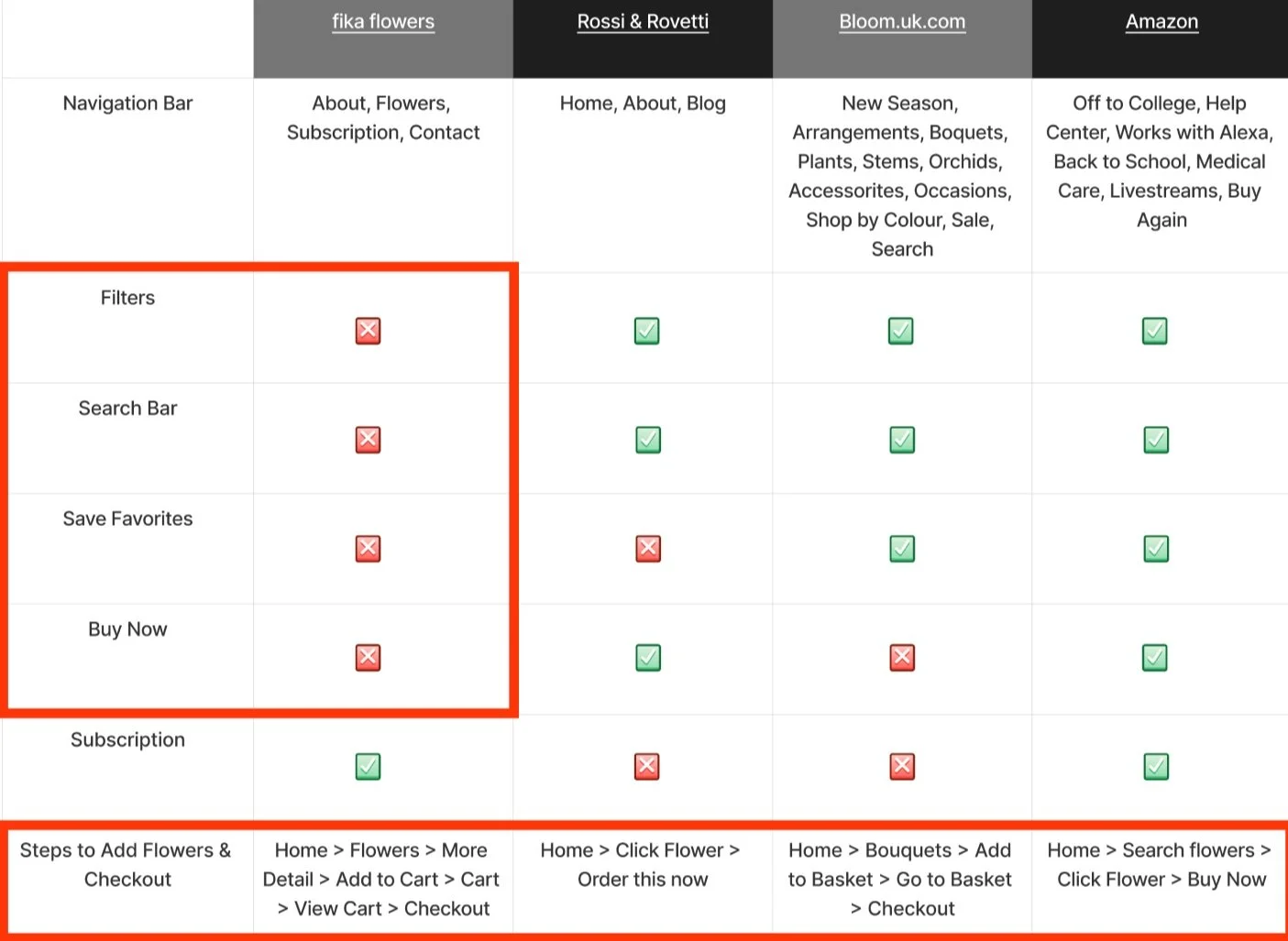 My Competitive & Comparative Analysis against other florists and larger e-commerce companies uncovered areas fika could use improvement on.